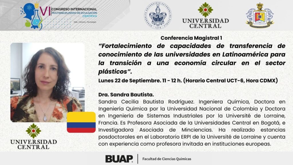 La Dra. Sandra Bautista será Ponente Magistral en el VI Congreso Internacional Multidisciplinario de Divulgación Científica, representando a la Universidad Central y al proyecto ERASMUS TechTraPlastiCE